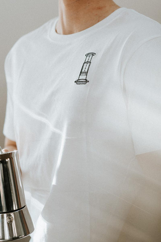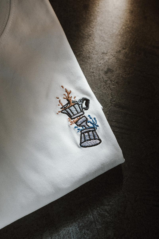 Hochwertig gestickte Motive auf lässigen T-Shirts von WZB Coffee Fashion. Fair und nachhaltig produziert am Chiemsee. Kostenloser Versand.